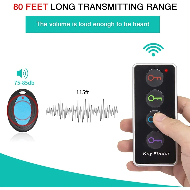 [Звуки и мини-светильник вспышки]: приемник для поиска ключей/звуковой сигнал, что позволяет отслеживать потерянный товар. Пульт дистанционного управления со светодиодным выключателем вкл/выкл расположен на правой стороне передатчика, он чрезвычайно удобен, когда вам нужно что-то найти в темноте.