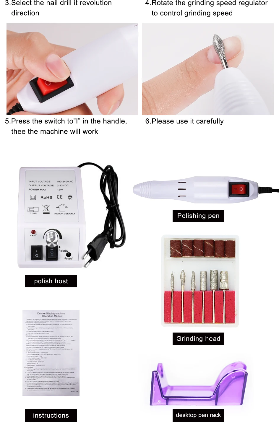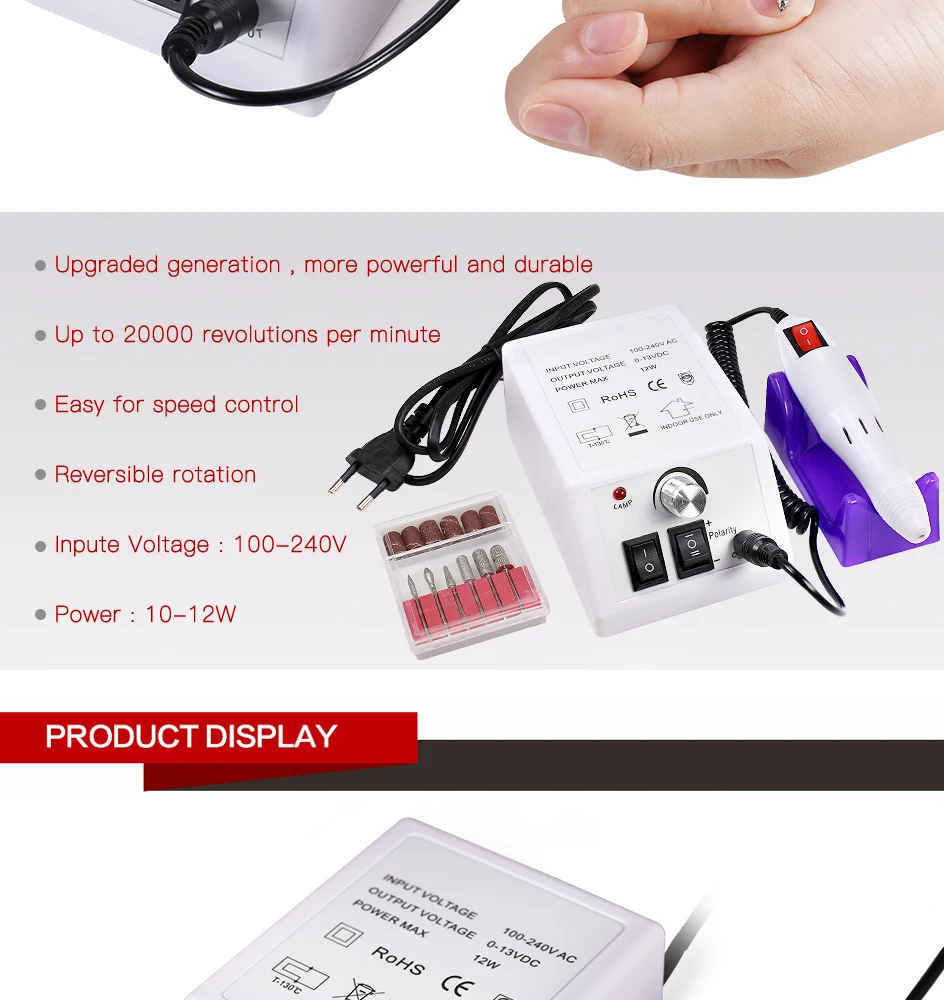 1х электрический сверлильный станок для дизайна ногтей: главный контроль + наконечник