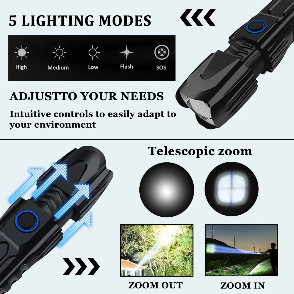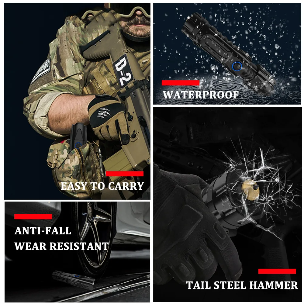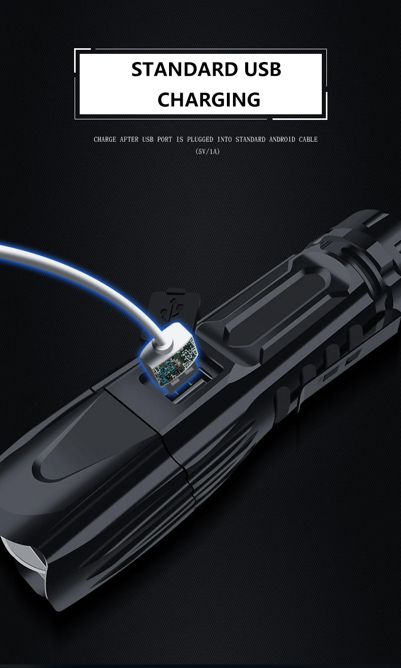 Funcionamiento correto de la linterna: 1: Presione y mantenga pulsado durante 1,5 segundos para encender el primer modo, alto brillo. 2: toca para cambiar otros modos: brillo medio, brillo bajo, modo SOS. 3: Pulsa 2 veces rаpidamente: Enciende el modo de parpadeo rаpido. Esta es una Linterna potente para uso en interiores o actividades al aire libre: кемпинг, senderismo, pesca o caza и т. д. utilza una sola Bateria recargable de iones de liio 26650. Cuenta con XHP50 светодиодный superbrillante/XHP70.2/XHP90 cuentas de Lampara, чип управления inteligente indicador de potencia de Bateria e intertaz de usuario mejorada. Es la mejor opción para iluminación de exterior portatil. Producto parаmetros bаsicos: Марка: YUNMAI Излучатель: XHP50 светодиодный/XHP70.2 светодиодный/XHP90 Материал: акрил Voltaje de funcionamiento: 2,8 V-4,3 V Opciones de Bateria: una Bateria 26650 Размеры: 140*45*40 мм ПЕСО: aproximadamente 225 (син батериас) Aleación de aluminio de grado aeroespacial 6061, CNC fabricado con acabado antiabasivo anodizado duro para conseguir un cuerpo sólido integrado, geomeotria antichoque y un mejor intercamde. Clasificación a prueba de agua: IPX-5 (anti-pulverización, непроницаемый, no para buceo) Iluminación: zoom telescópico Tiempo de vida: luz fuerte-3 horas, luz media-5 horas, luz baja-8 horas Протекцион де bajo voltaje: cuando el voltaje de la Bateria es demasiado bajo, se apagara automaticamente. Инструкции: las cuatro luces se encienden constantemente una por una Indicación de descarga: cuatro cuentas de lagpara se extingan una por una Rendimiento de compresión: 2,5 toneladas de prueba de laminación del coche. Modo de Salida: Salida USB Potencia de salida: 5V-1A Modo de carga: Carga USB 5V Micro USB Tiempo de carga: 3-6 horas Анти-пульверизатор, анти-тормена. Без использования para bucear
