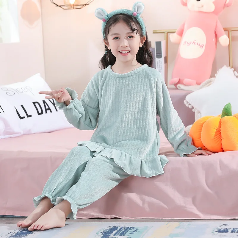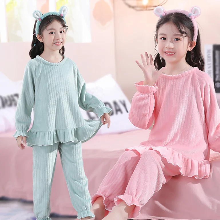 Милые зимние теплые пижамы для девочек от 3 до 12 лет Детская одежда для сна с длинными рукавами, фланелевые топы, штаны мягкие пижамы утепленные с кружевными воланами
