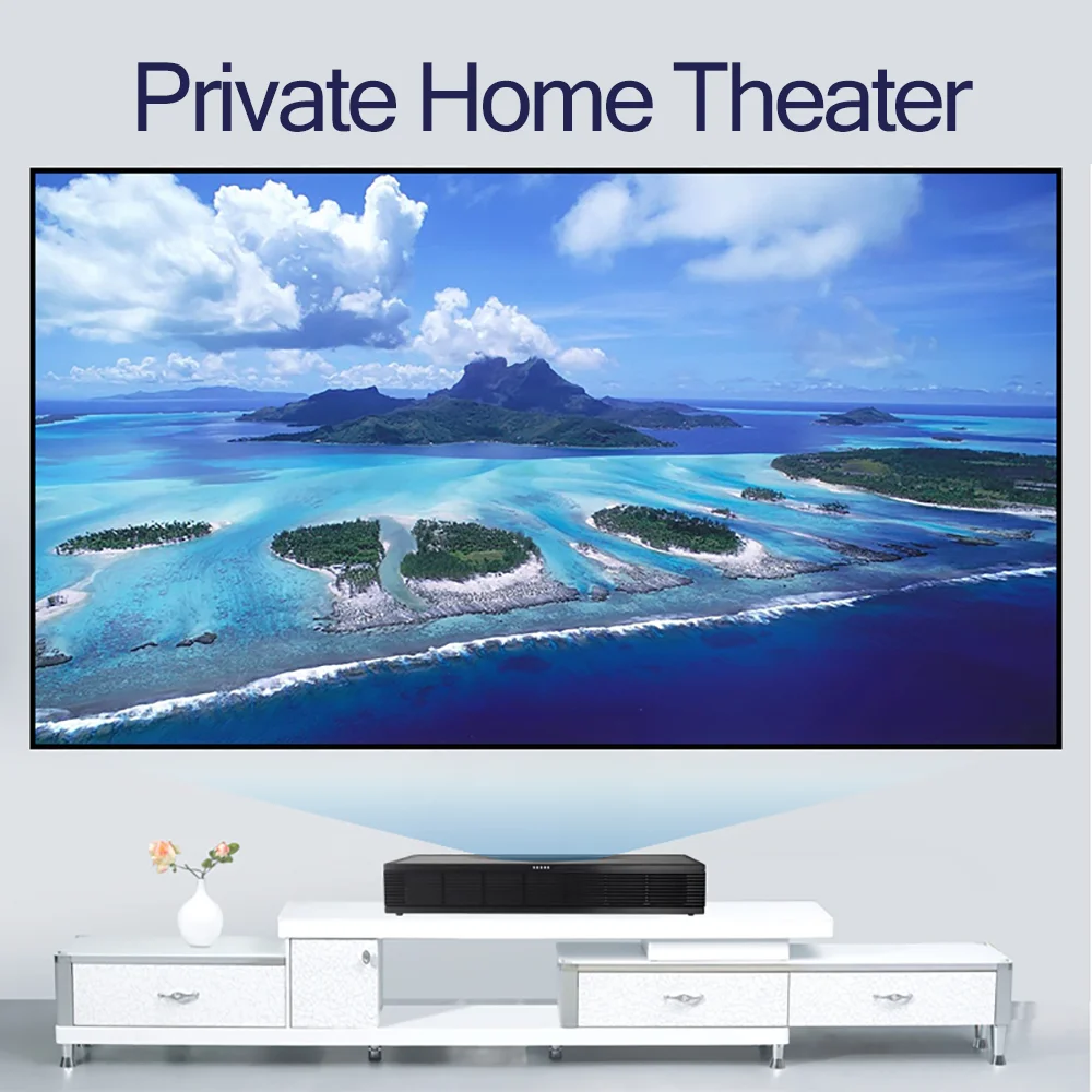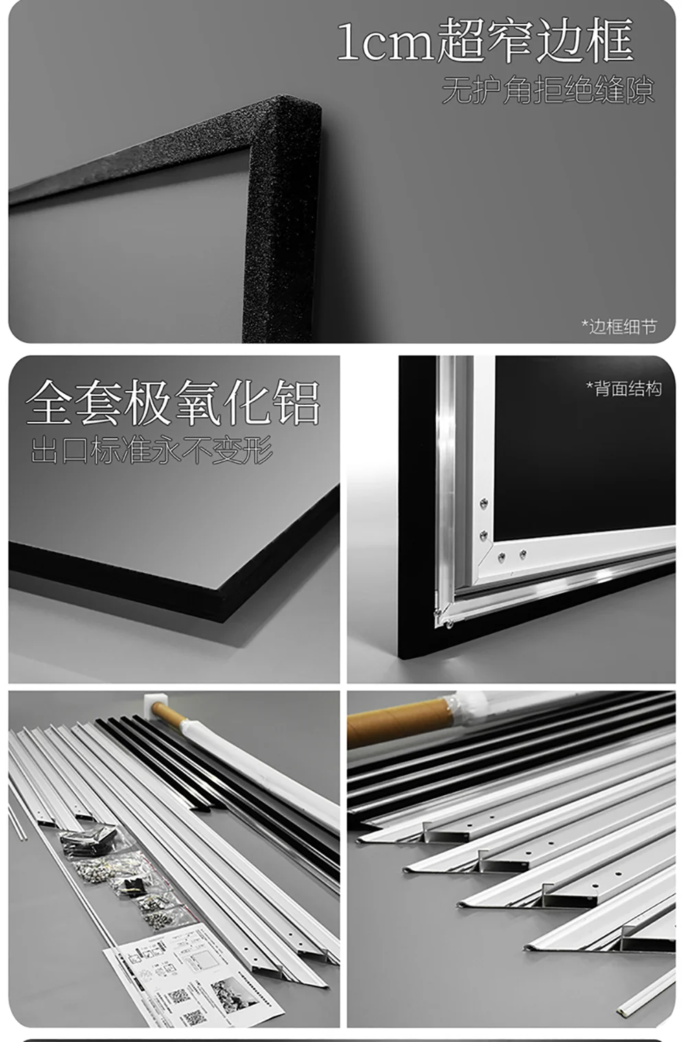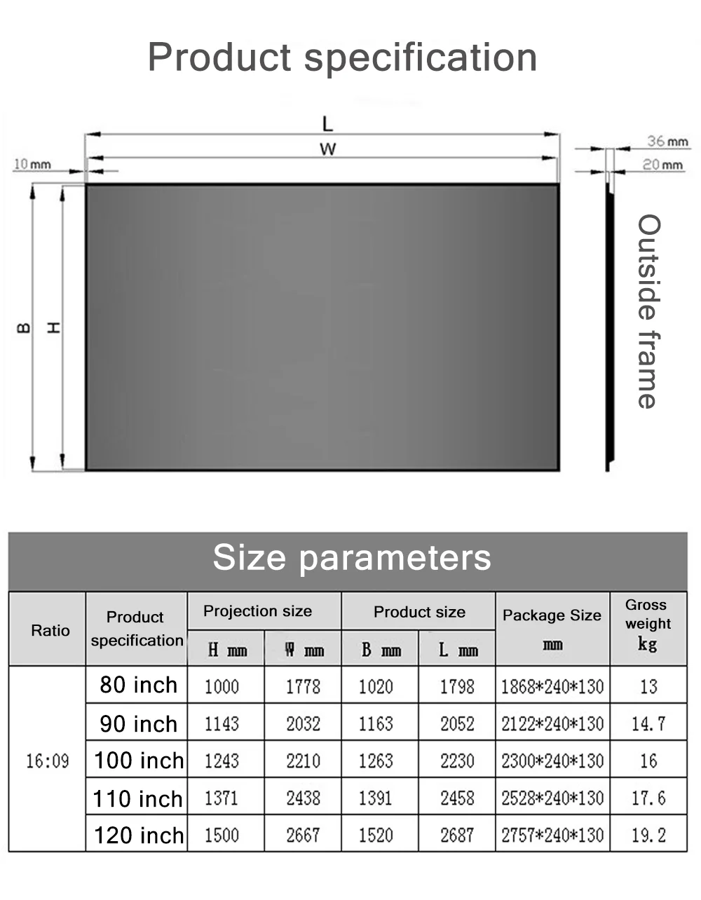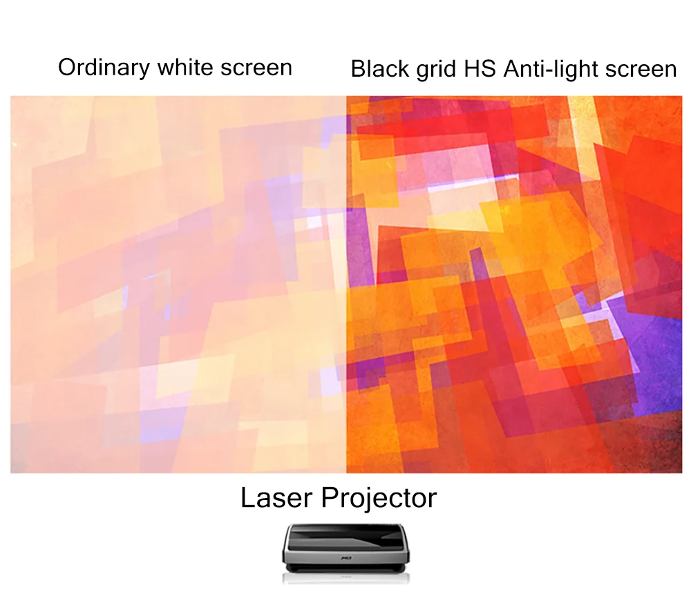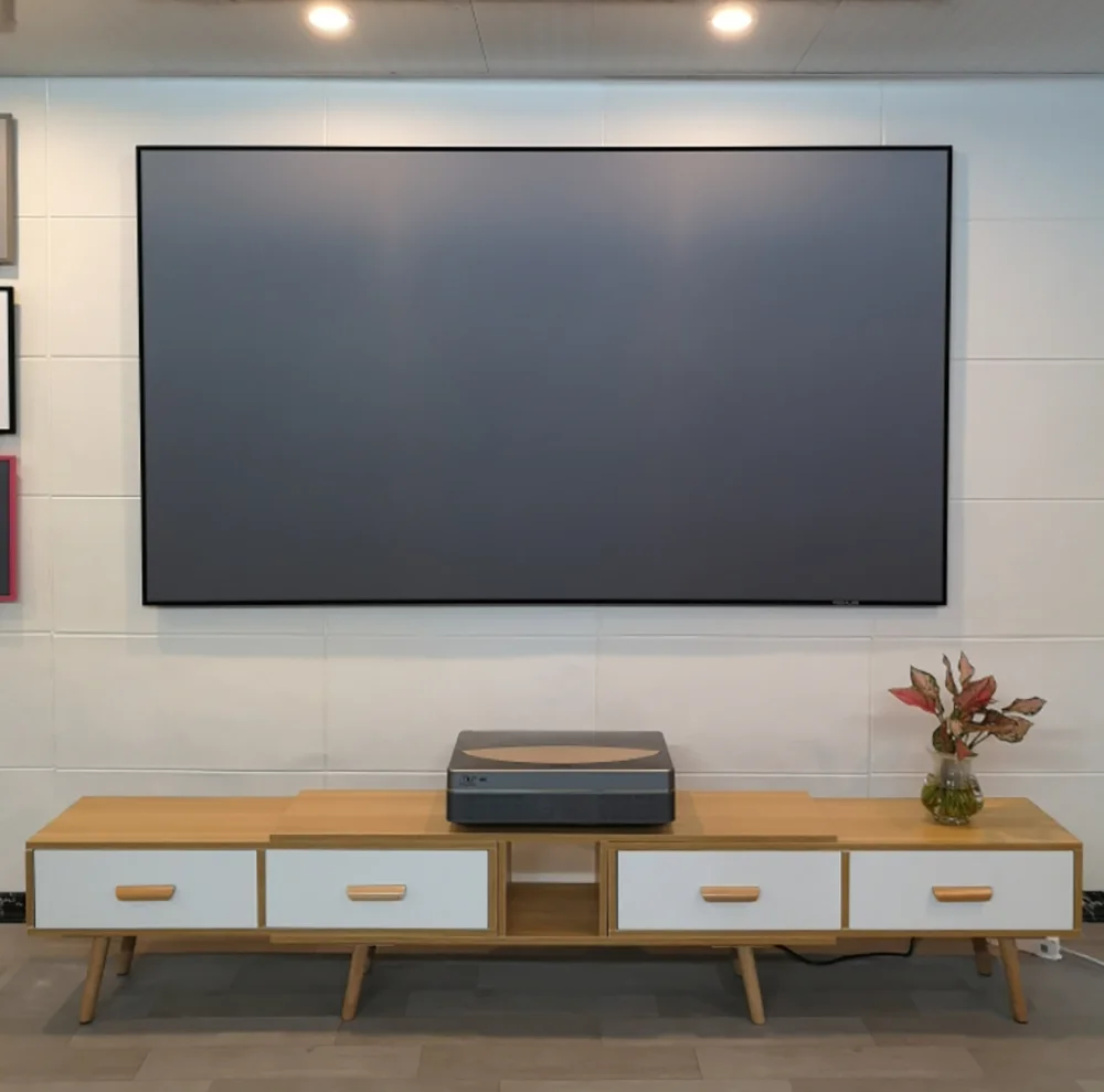 Революционный продукт, разработанный в сочетании с ультра-короткими проекторами. Если Расстояние проекции составляет 35 см, изображение может достигать 80 ". Слой затенения экрана блокирует окружающий светильник, так что изображение имеет лучший контрастный эффект, поэтому вам больше не нужно выключать светильник s для проекции.