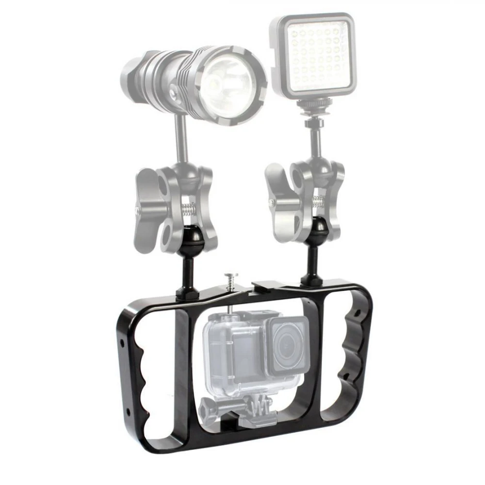 1. Двойная портативная ручка, уникальные персонализированные кнопки, нетрадиционный дизайн 2. Его можно использовать в качестве системы стабилизации изображения или в качестве конечной Дайвинг-установки для вашей камеры 3. Для GoPro специальный водонепроницаемый корпус, основной материал-алюминиевый сплав 4. Алюминиевые компоненты, модульная конструкция с штепсельной шаровой головкой 5. Процесс ЧПУ и легкий алюминиевый сплав, легко носить с собой 6. Портативная селфи-палка или фиксированное соединение могут быть подключены 7. Можно подключить одновременно светильник для фотостудии 8. Нажимной ключ только для GoPro, базовое Крепление подходит для всех GoPro и экшн-камер. 9. Примечание: показывающая камера и видео светильник не включены 10. Вес: 0,32 кг/0.926lb