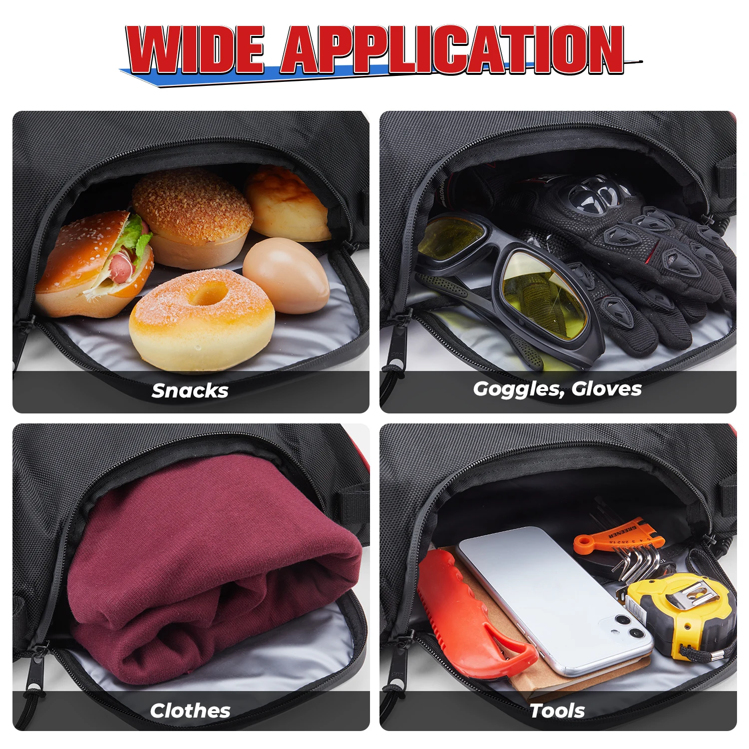 Дизайн: Черная нижняя часть с красной полоской, боковая ткань из углеродного волокна, стильный и уникальный дизайн Материал: Изготовлен из ткани Оксфорд 1680D, водоотталкивающий, устойчивый к царапинам и не рвется, устойчив к ультрафиолетовому излучению и не выцветает Удобный: Спереди имеется серая светоотражающая полоска косточки, что удобно райдеру найти застежку-молнию, открывающую сумку для хранения в ночное время. На верхней части сумки для хранения есть ручка, которую можно носить вручную Особенность: Данная Лыжная сумка оснащена термоизоляционной пленкой, при использовании санок для транспортировки вещей их можно разместить на долгое время, не беспокоясь о ухудшении. Функция хранения: Отличная дополнительная сумка для дополнительного хранения санок. Эта сумка под сиденьем обеспечивает тонну места под сиденьем, не занимая место в туннеле, что достаточно большое, чтобы носить предметы первой необходимости. Емкость хранилища: 500 куб. В. Объем. Установка: Легко устанавливается, закрепляется на полке под сиденьем с помощью липучки Обновленная версия: Изготовленная из модернизированной водонепроницаемой ткани Оксфорд 1680D, красивая сумка под сиденьем для снегохода прослужит долгий срок службы и отлично повысит прочность. Примечание: не работает с туннельной сумкой.