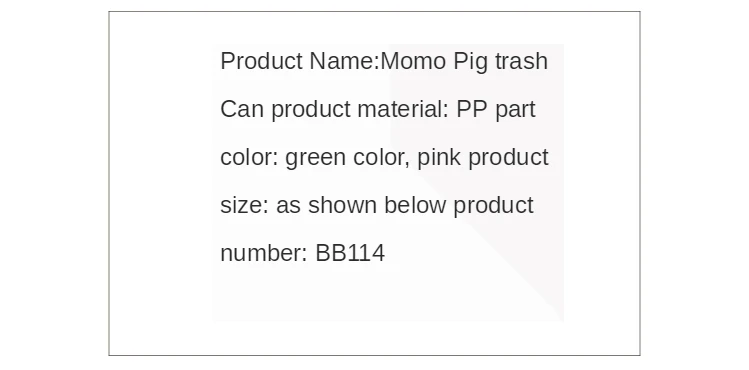 Информация о продукте Название продукта: Очаровательная свинка мусорная корзина Материал изделия: полипропилен Цвет изделия: зеленый, розовый Размер изделия: как показано на следующем рисунке Артикул: BB114