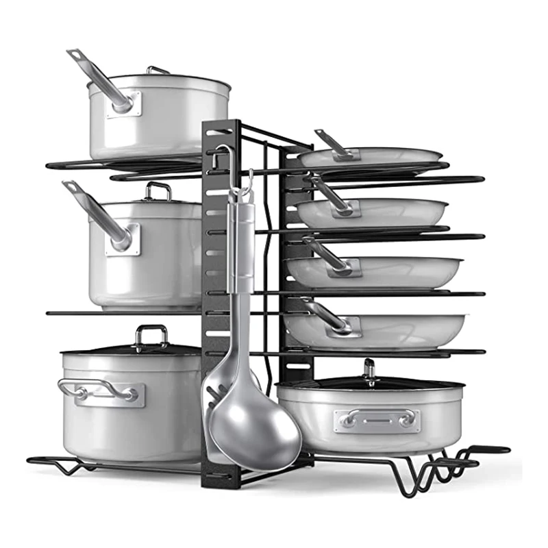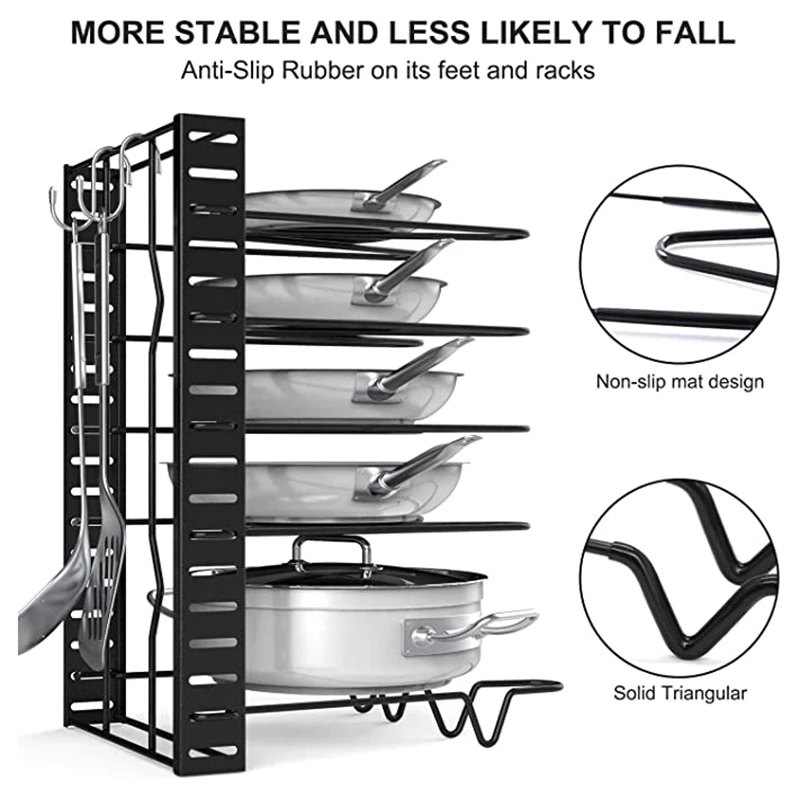 1. Экономия пространства: держатели кастрюль для прилавка. Это идеальное решение для хранения всех кастрюль и сковородок, организация, укладка и отдельные кастрюли и сковородки, листы печенья и разделочные доски экономят вам много места на кухне или в шкафу и столешнице. Этот органайзер может хранить до 8 крышек и кастрюль, помогая кухне оставаться аккуратной и организованной.