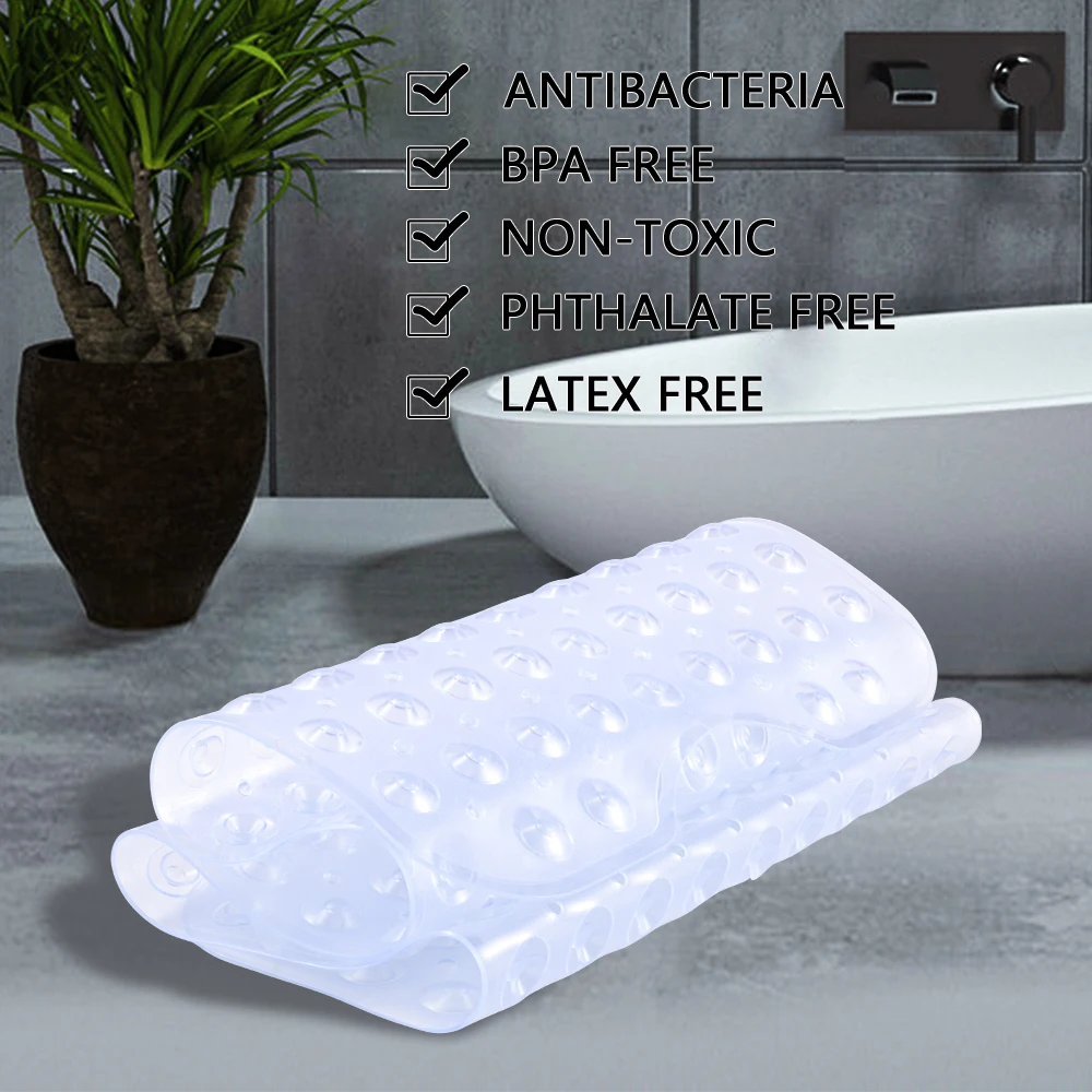 -- Устойчивость к скольжению Для ванны и душа: Изготовлен из прочного, высококачественного винила с удобным и эффективным текстурированным рисунком поверхности для надежной нескользящей тяги. -Крепкий захват: этот коврик оснащен 200 мощными присосками, которые надежно удерживают коврик, хорошо прилипает и остается на месте. Тонкий текстурированный узор на поверхности защищает вас от скольжения или падения в ванной. -- Отличный дренаж: обильные сливные отверстия по всему защитному коврику уменьшают поверхностную воду, сохраняя поток воды во время использования и позволяя быстро высыхать после использования. -- Легко чистить: Наш коврик можно стирать в стиральной машине, чтобы сохранить его свежий внешний вид. Мы настоятельно рекомендуем мыть коврик перед использованием. Стирать в стиральной машине в холодной воде с мягким моющим средством (без отбеливателя) и сушить на воздухе. Периодически высушивайте краску и периодически удаляйте масляные и скользкие нарастания, которые могут возникнуть из различных мыла и продуктов для волос. Если вы столкнулись с сильным запахом, когда посылка была впервые открыта, мы рекомендуем разрешить матрацу проветриваться в хорошо проветриваемом помещении в течение 24 часов перед использованием. -- Предупреждение: Предотвращение падений: безопасные присоски перед каждым использованием. Коврик прикрепляется только к чистой, гладкой поверхности. Не для использования на текстурированных, плиточных или негладких поверхностях. Не используйте масло для ванны-может привести к скольжению.