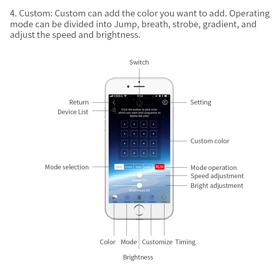 4. На заказ можно добавить цвет, который вы хотите добавить. Рабочий режим можно разделить на прыжок, дыхание, стробоскоп, градиент и регулировать скорость и яркость.
