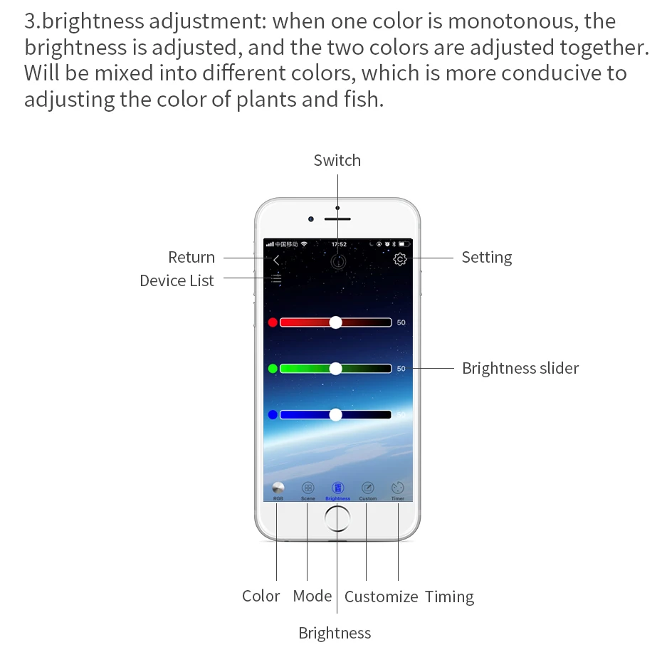 3, регулировка яркости: когда один цвет монотонный, яркость регулируется, и два цвета регулируются вместе. Будет смешиваться в разные цвета, что больше способствует корректировке цвета растений и рыб.