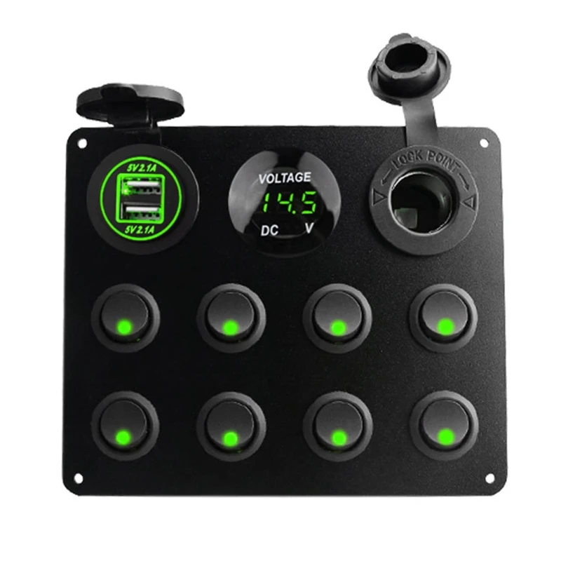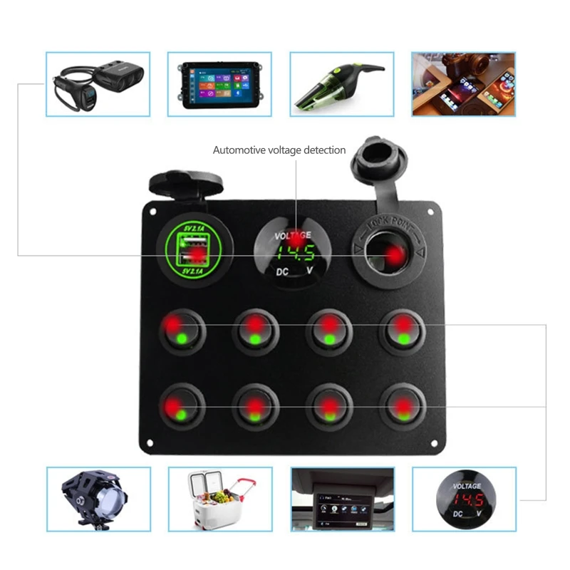 Многофункциональная Панель: двойная USB розетка + Вольтметр + 12 В розетка 8 переключателей