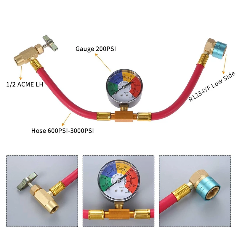 Размеры, автоматический 1/2 ACME LH R1234YF AC хладагент консервный нож кран Дозирующий клапан, 600-3000PSI шланг, 200 PSI манометр, и R1234YF низкобоковой адаптер.