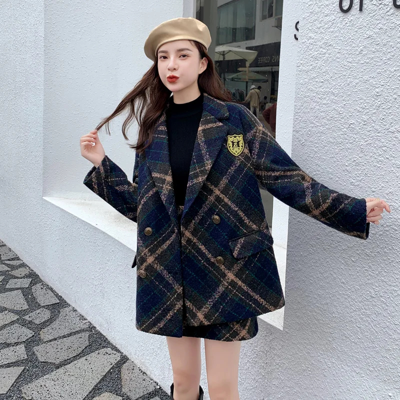 Отзывы о Костюм женский шерстяной твидовый двубортный пиджак в клетку с длинным рукавом и