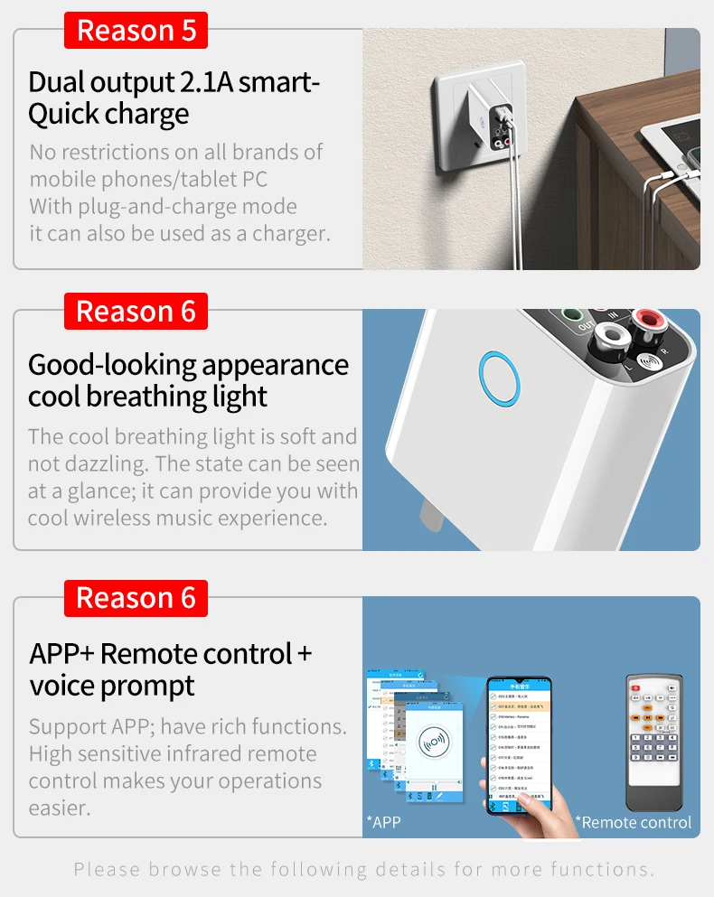 Получение: адаптер может получать аудио-сигнал, совместимый с Bluetooth, через мобильный телефон и другие устройства, а затем выводить аудиосигнал через режим AUX / RAC.