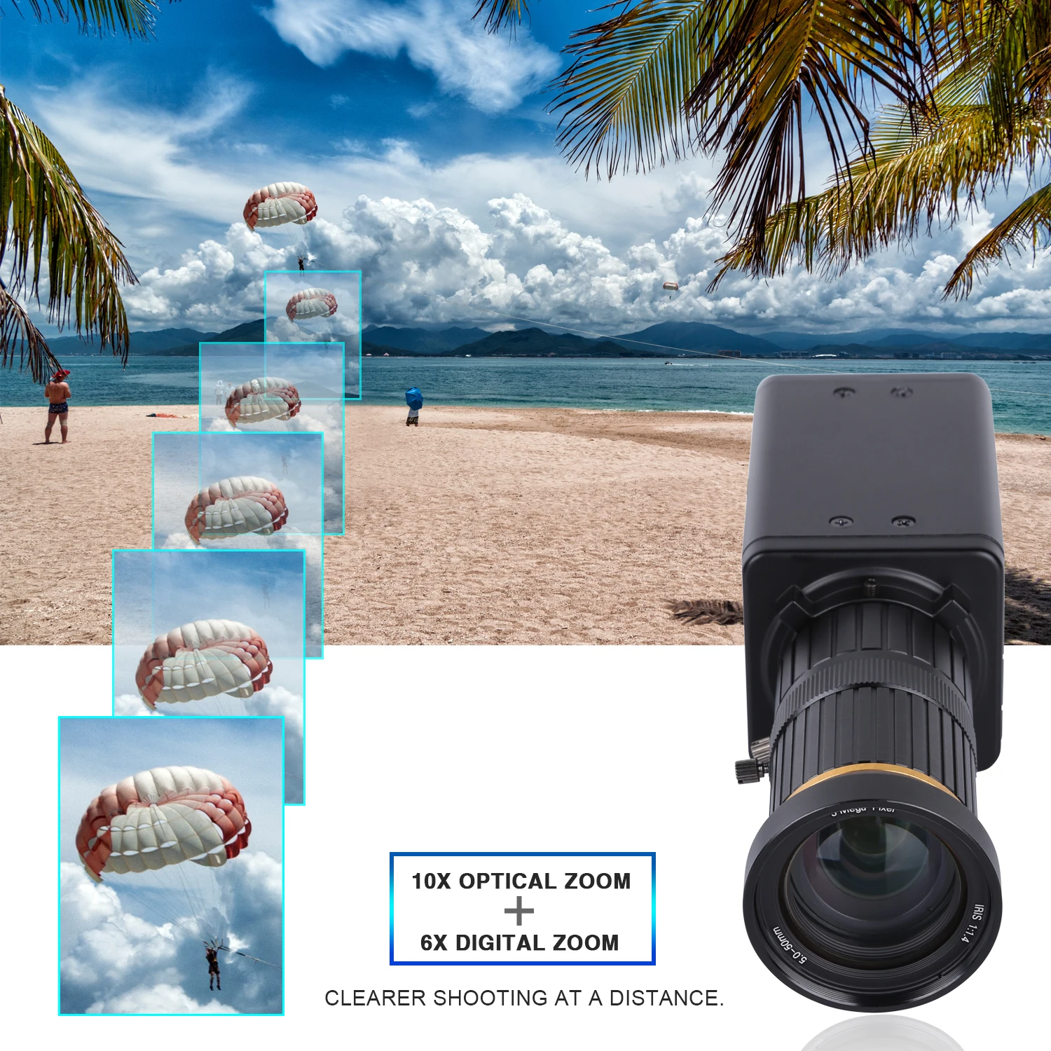 10-кратный оптический зум для объектива и 6-кратный цифровой зум для программного обеспечения, широкий угол 80 °, очень подходит для съемки крупным планом на расстоянии, высокое разрешение без искажений.