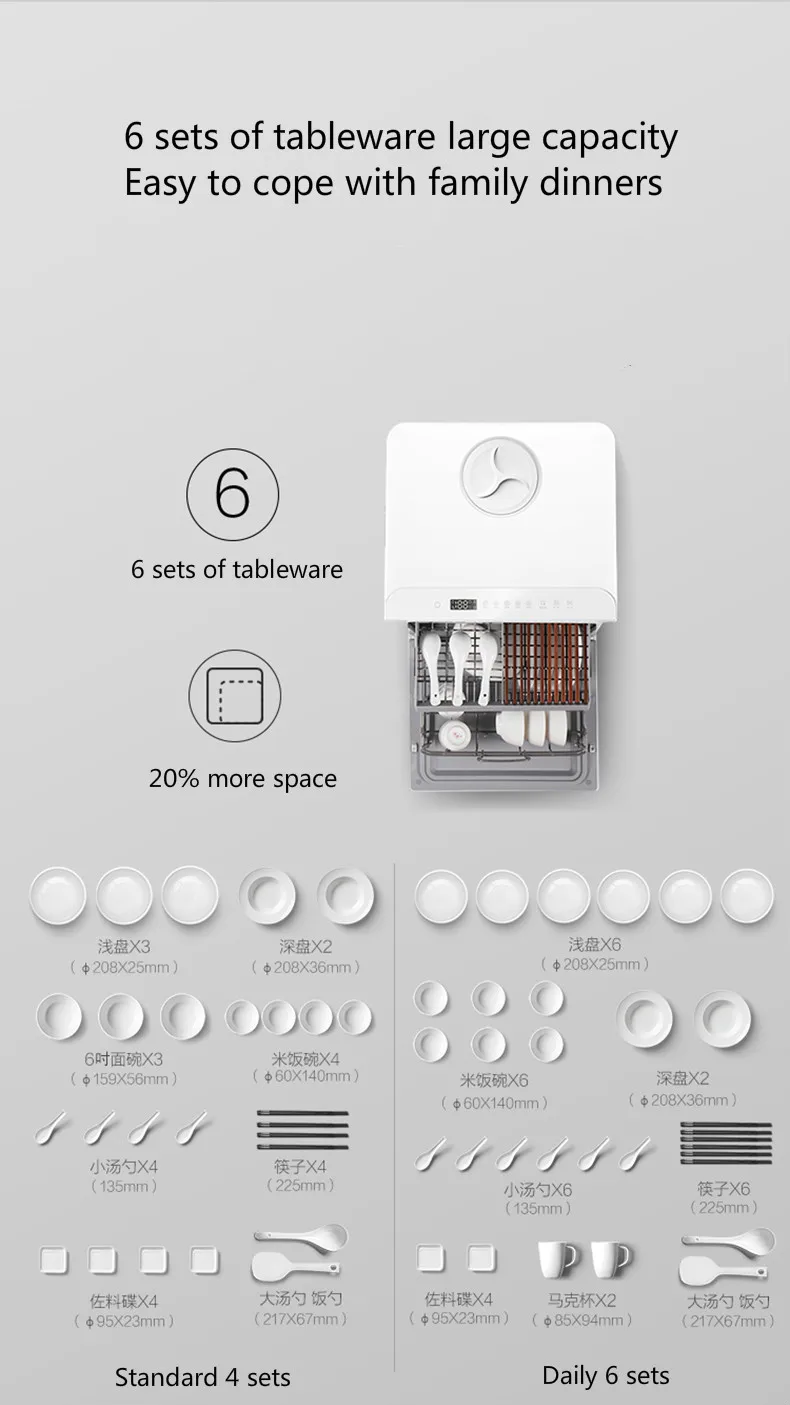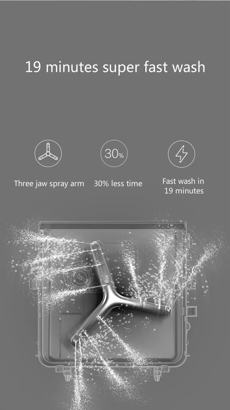 Сверхбыстрая стирка за 19 минут6 наборов посуды большой емкости3D спрей без тупиковЭкономия воды, чем ручная стирка