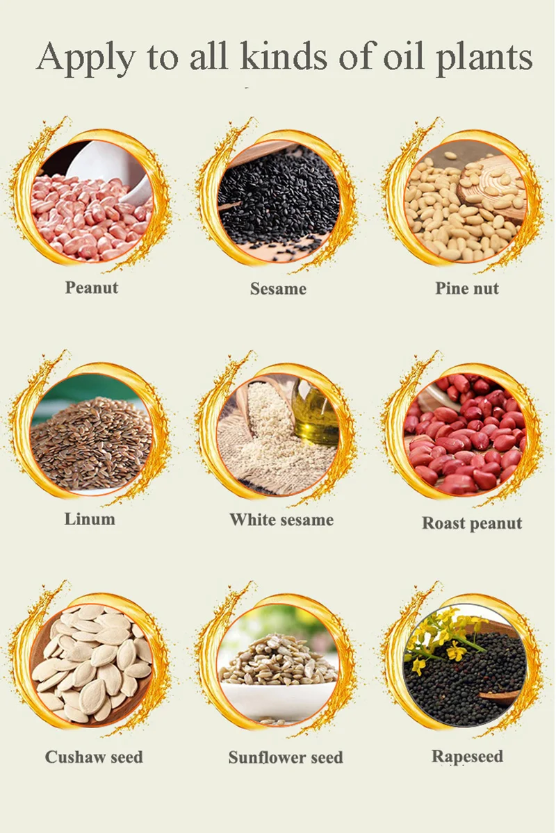 * Многофункциональный домашний/коммерческий пресс для масла машина для арахиса, кокоса, кунжута, сои, орехов макадамии, грецких орехов, семян подсолнечника, семян овощей, льняных семян и так далее * Двигатель является промышленным двигателем, который может продолжать работать более 5 часов. Мы предлагаем работать в течение 5 часов и отдыхать около 1 часа. Это будет хорошо для срока службы машины * Скорость извлечения масла составляет до 50%, что зависит от семян масла * Простота в эксплуатации, очистка и перемещение.
