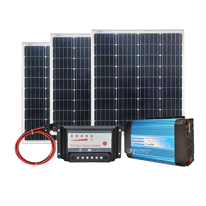 Набор солнечных панелей 1000 Вт включает в себя 3 шт солнечной панели 100 Вт, 1 набор контроллера солнечного заряда 12 В/24 В 30A ,1 комплект солнечного синусоидального инвертора 12 В/24 В/220 В 1000 Вт и 1 комплект кабеля