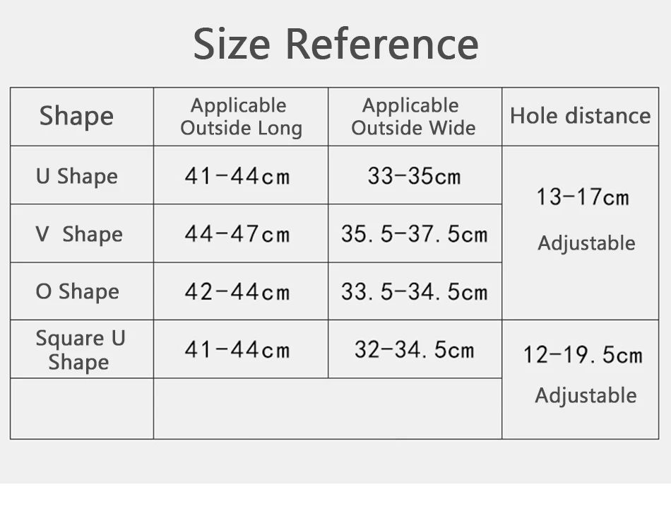 Форма применимо за пределами длинные применимое снаружи Широкий расстояние между отверстиями U форма см-41 см-44 см 33-35 см на 13-17 см регулируемая v-образной формы 44-47 см 35,5-37,5 см круглая форма 42-44 см 33,5-34,5 см квадратный U форма см-41 см-44 см 32-34,5 см 12-19,5 см регулируемая