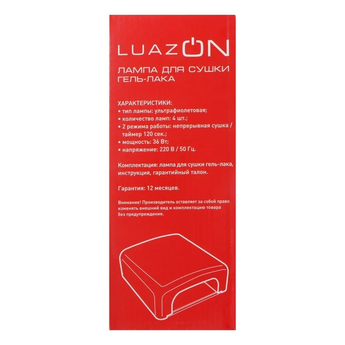 Ультрафиолетовая лампа LuazON предназначена для быстрой и качественной полимеризации материалов, которые используются для ухода за ногтями (базы, гель-лаки, топы и др.).