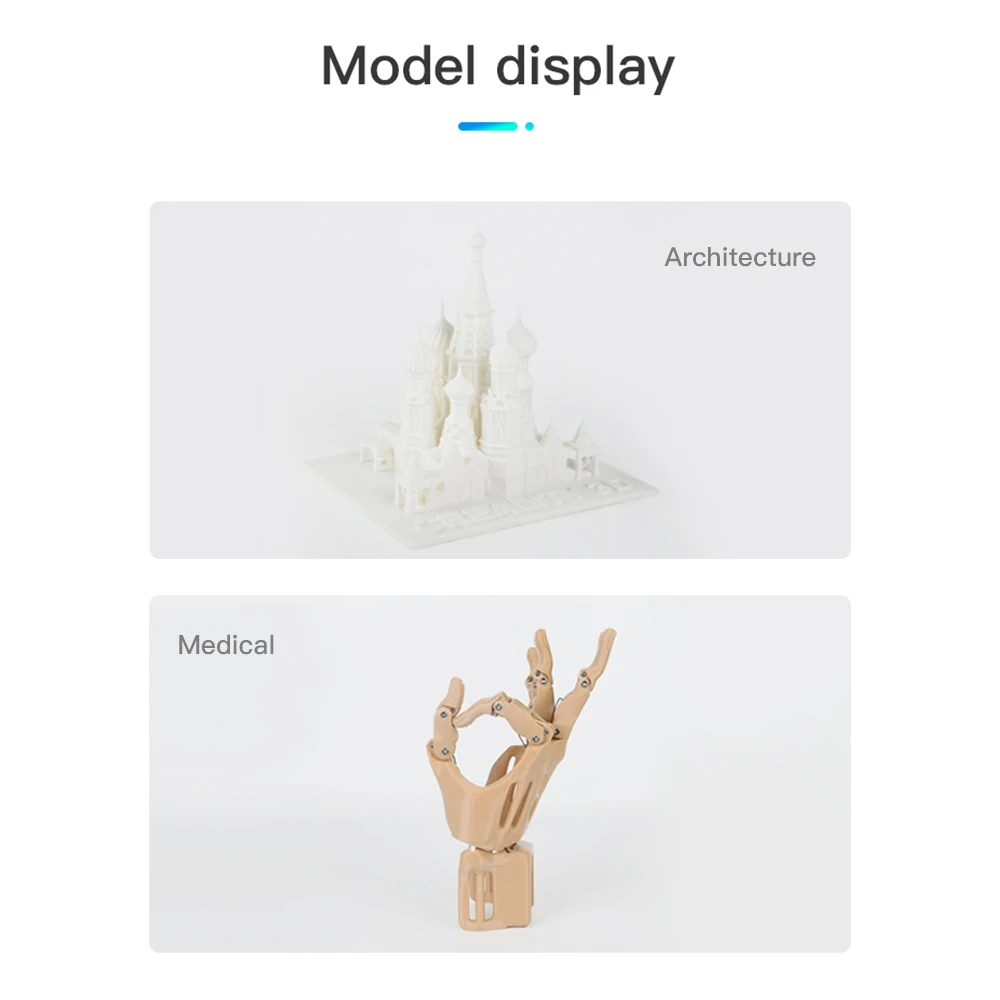 Широкое применение:Практичный 3D-принтер с цветным сенсорным экраном 4,3 дюйма, широко используется в украшении дома, игрушках, архитектуре, образовании, медицине, предметах первой необходимости и других областях.