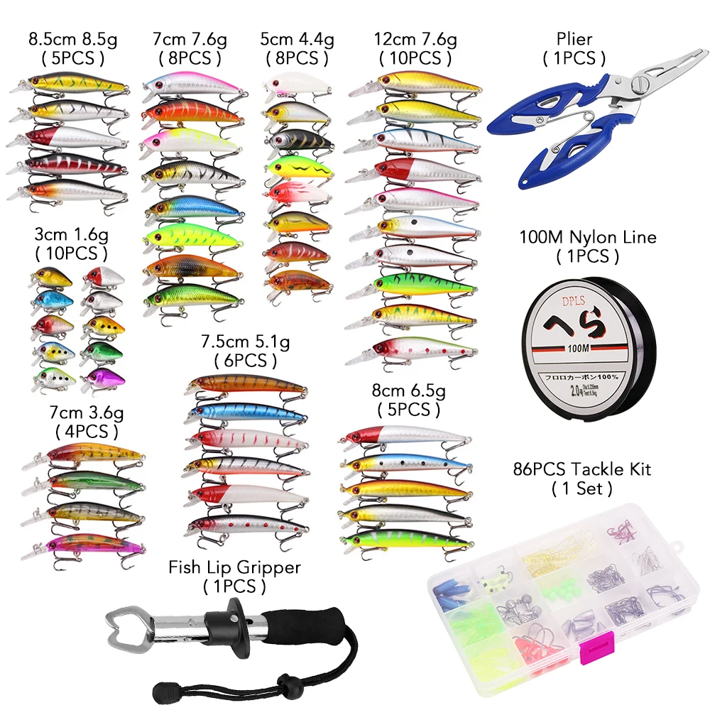 145 шт. набор рыболовных снастей включает в себя 56 * minnow приманки, 20 * мягкие приманки, 15 * джиг крючки, 5 * Кривошип крючки, 10 * тройные Крючки, 10 * бусины, 5 * вес, 20 * вертлюгов и защелок, 1*100 м нейлоновая линия, 1 * плоскогубцы, 1 * Захват для губ рыбы, 1 * коробка аксессуаров.