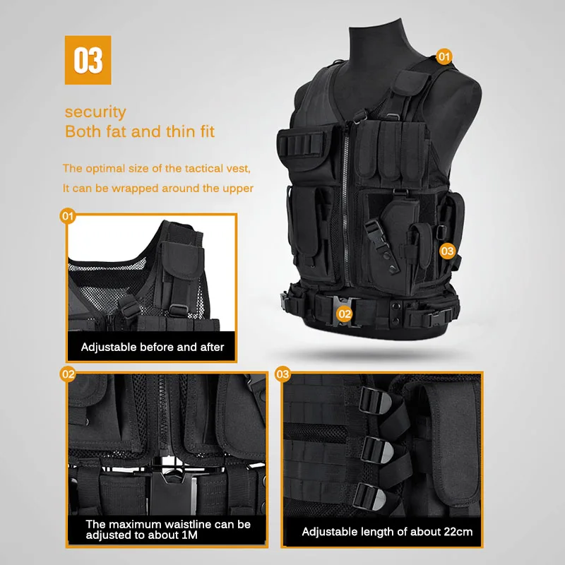 Изготовлен из прочного, удобного полиэфира высокой плотности 600D, больших прочных молний и сетки. Тактический жилет является жестким и отлично подходит для игр CS, страйкбола, пейнтбола, боевых действий и сражений.