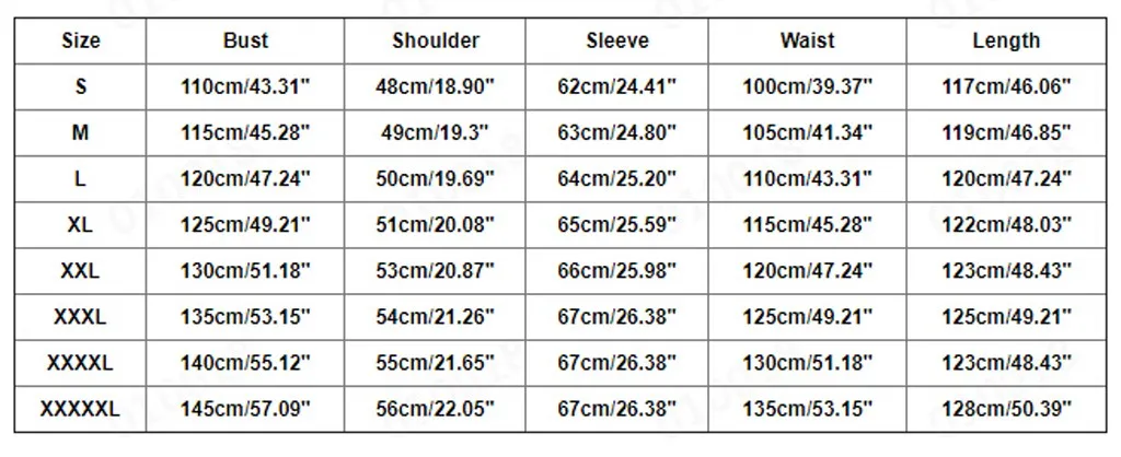 | XXXXXL | 145 см/57,09 дюйма | 56 см/22,05 дюйма | 67 см/26,38 дюйма | 135 см/53,15 дюйма | 128 см/50,39 дюйма |