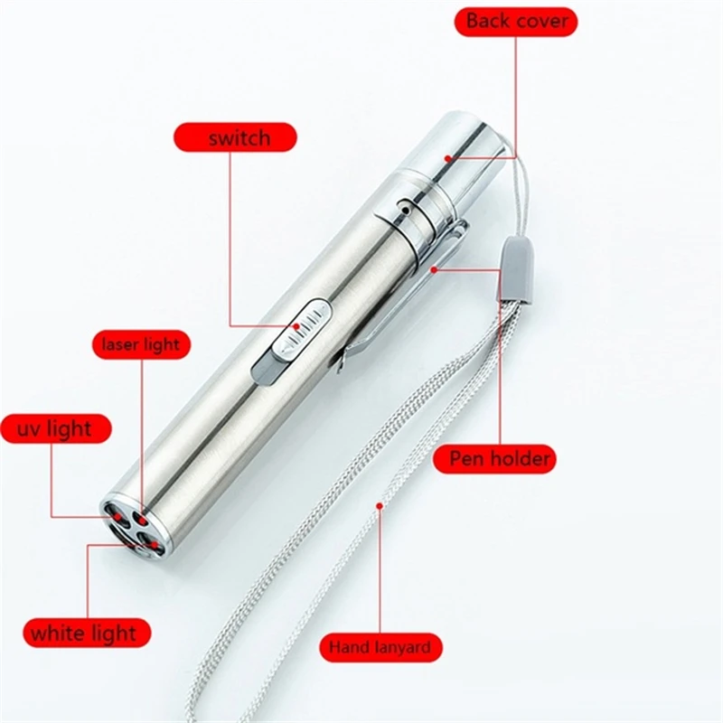3 в 1 многофункциональная перезаряжаемая игрушечная лазерная указка из нержавеющей стали, USB мини светодиодный светильник-вспышка с фиолетовым светильник, поддельная лампа, медицинский маленький светильник-вспышкаПортативный светодиодный фонарик с лазерной указкой, перезаряжаемый УФ-фонарик, многофункциональная лампа