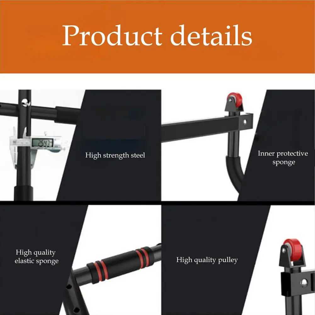 1. Изготовлен из стальной трубы, прочный, максимальная несущая способность составляет около 110 кг.2. Нескользящий пенный захват обеспечивает широкий, узкий и нейтральный захват подтягивания упражнений.