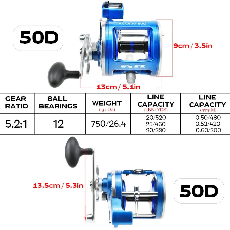 50D | Вес: 750g | Передаточное число: 3,8: 1 | Максимальная сила натяжения: 28 кг | Линия Ёмкость: 05 мм/4800 м 0,60 мм/300 м
