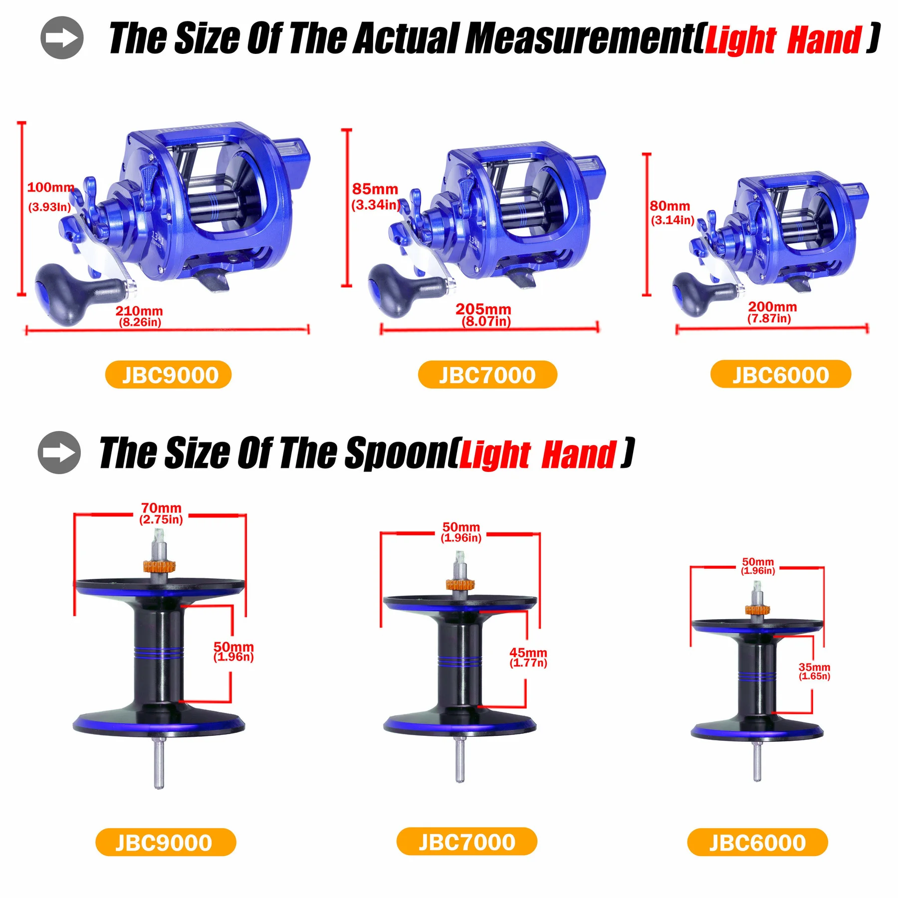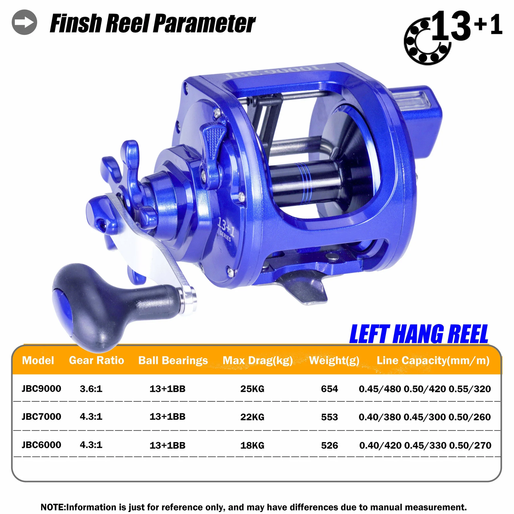 Синий левое JBC9000 | Вес: 654g | Шестерни передаточное число: 3,6: 1 | Подшипника: 13 + 1 | Максимальная сила натяжения: 25 кг | Линия Ёмкость (мм-М): 0,45/480 0,50/420 0,55/320