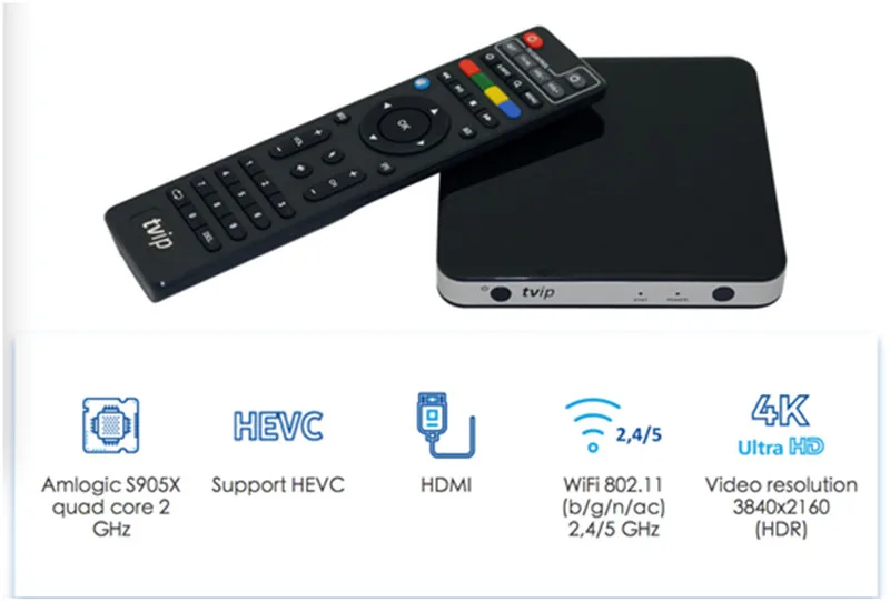 ЧипсетЧетырехъядерный процессор Amlogic S905X 2 ГГцВидео risolzione3840x2160 (HDR)Grafica 3DOpenGL ES 2,0 (Mali-penta core)ЗапоминаниеRAM 1 Гб, Flash 8 ГбInterfacceHDMI, AV, Ethernet, 2 xusb, MicroSD карты, и тд. ИК, WiFi 802,11 (b/g/n/ac) 2,4/5 ГГцСистема operativoLinux o Android 6,0 (Marshmallow)Вспомогательное промежуточное поTVIP, IPTVPORTAL, Stalker, HTML5/JS portaliИнициализация remotoTR-069 o TVIP XMLContenitoriMPEG-TS, MPEG-PS, MP4, MKV, AVI, MOV, FLV, OGGПрототипUDP, RTP, HTTP, HLS, RTSP, SMB, NFSCAS/DRMTVIP, IPTVPORTAL, BISS, Widevine & #1080; Verimatrix 3.x- opzionaleВидео кодекаH.265 (10 бит), VP9, H.264, MPEG4 ASP, Xvid, MPEG2, MJPEG 2160 p 60fpsАудио кодекMPEG/MP3/MPA, AAC, WMA, OGG, WAV, FLAC, APEСоттотитолиDVBSUB, VOBSUB, televideo, SSA/ASS, SubRipImmagini