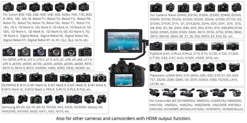Монитор F5 Pro V2 совместим с различными камерами, такими как SONY, Canon,Nikon, Panasonic, FUJIFILM, Leica, OLYMPUS. PENTAX и т. Д. Совместим с различными камерами, такими как SONY, Canon,Nikon, Panasonic, FUJIFILM, Leica, OLYMPUS. PENTAX и т. д.