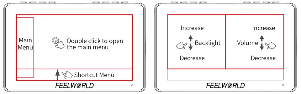 Вы можете нажать на экран или Физические кнопки, чтобы просмотреть меню и установить функции. Система распределения ключей F5 Pro проста и проста в эксплуатации. В верхней части монитора есть 2 Пользовательские функциональные кнопки, вы можете установить их как обычно используемые функции. Вы также можете установить функцию быстрого доступа левой и правой клавиш непосредственно в функции настройки меню, которая может быть настроена на регулировку подсветки или регулировки громкости, непосредственно нажмите «﹤», чтобы уменьшить значение; Непосредственно нажмите «﹥», чтобы увеличить значение. И монитор автоматически сохранит заданные вами параметры и сохранит исходные настройки при следующем включении. Его не нужно сбрасывать, что удобно и просто.