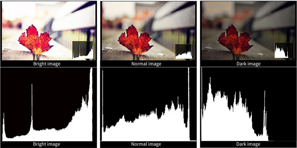 Гистограмма яркости является количественным инструментом для проверки яркости изображения. Функция показывает Распределение яркости на изображении как график яркости по горизонтальной оси (слева: темно, справа: ярко) И стек количества пикселей на каждом уровне яркости по вертикальной оси.
