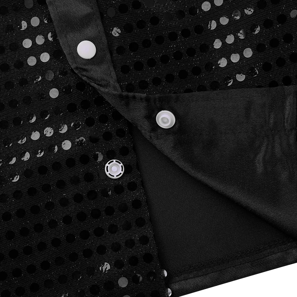 Длинные рукава, отложной воротник, украшено блестками спереди.