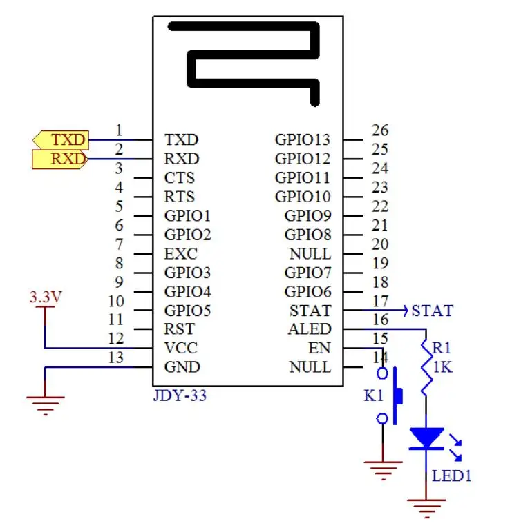 JDY-33 обычному приложению необходимо только подключить 4 контакта VCC, GND, RXD, TXD, если он отключен во время подключения,