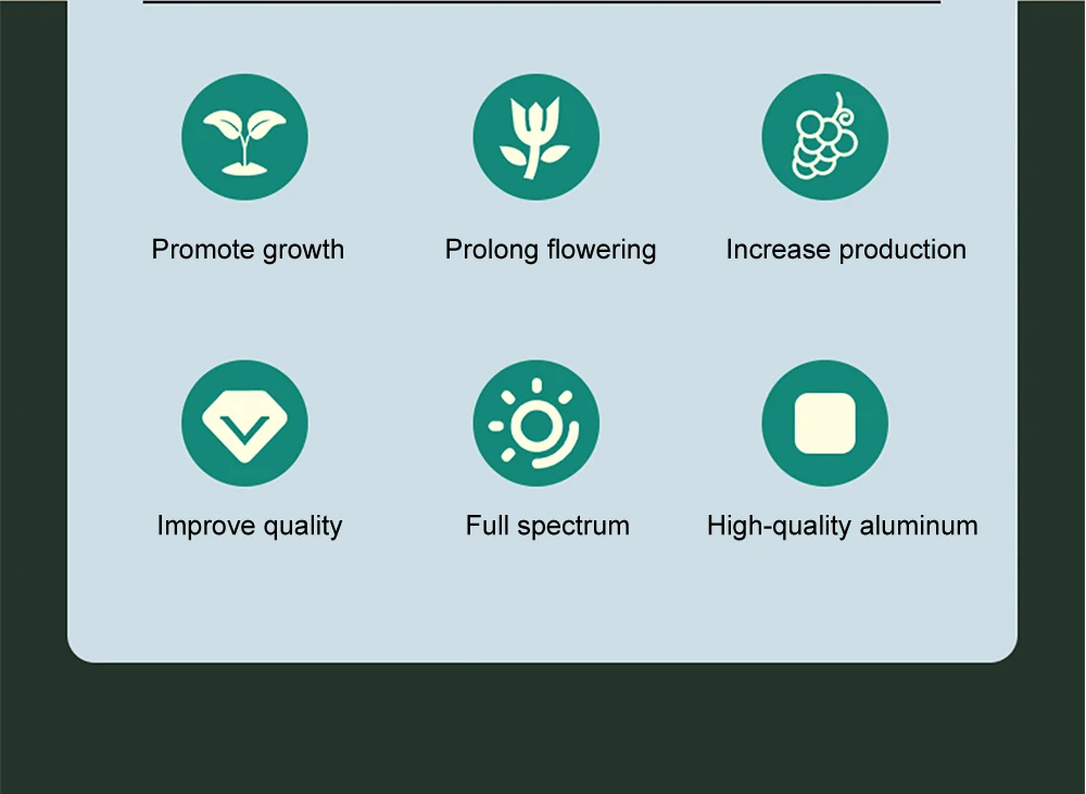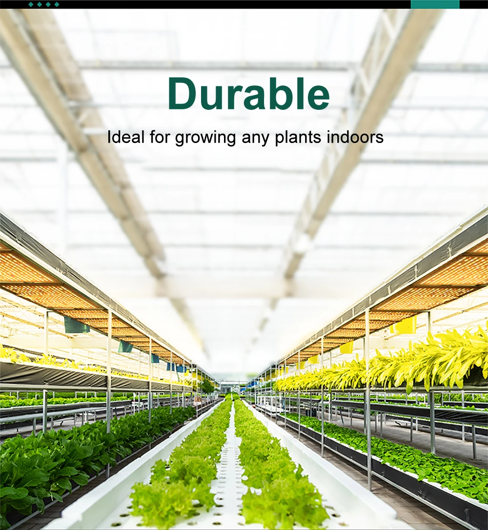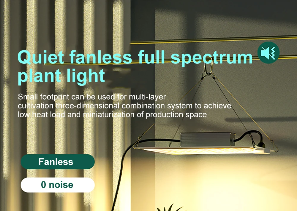 Без вентилятора, без шума и водонепроницаемости. Нулевой шум без дополнительных вентиляторов. В противном случае, этот светильник для роста растений использует усовершенствованный водонепроницаемый источник питания, который устанавливается на открытом воздухе и легко заменяется. Светильник имеет технологию герметизации, поэтому весь светильник для роста растений имеет водонепроницаемую функцию. Не нужно беспокоиться о влажной среде посадки повредит растительный светильник