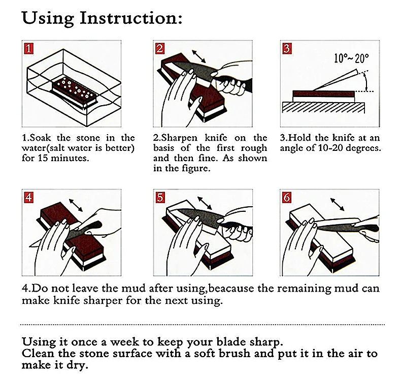 1. Замочите камень в воде в течение 5-15 минут, а затем положите его на устойчивую платформу. Заточка ножей одним или двумя шагами определяется степенью тупой инструмент.