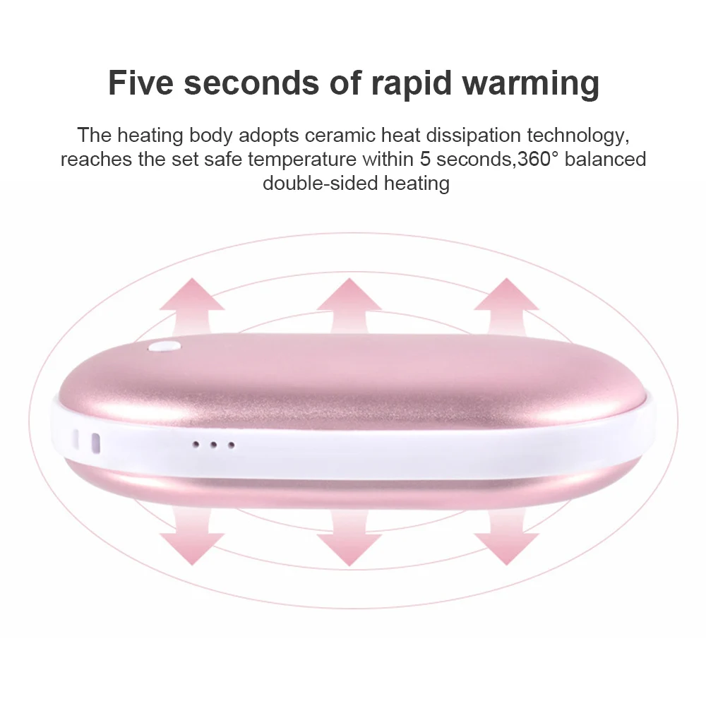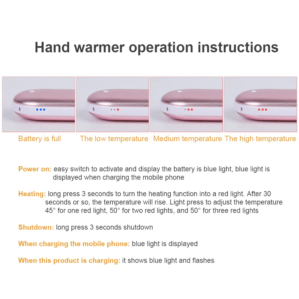 Двухстороннее тепло: аналогичная грелка для рук на рынке может нагреваться с одной стороны, в то время как этот продукт нагревается с обеих сторон, более уютно в использовании. Размер идеально соответствует форме руки, вы можете просто держать его в руке, чтобы получить уютное тепло в холодную зиму. | Интеллектуальный контроль температуры: он будет автоматически спать в нерабочем состоянии, чтобы предотвратить потерю энергии. Энергосбережение. | 3 Уровня Температуры: 3 температуры на выбор, вы можете выбрать в соответствии с вашими потребностями. | 2 в 1 дизайн: он может использоваться как внешний аккумулятор или грелка для рук, очень практичный для использования. | Оснащен защитной панелью для предотвращения избыточного заряда, разрядки, короткого замыкания; Может автоматически обнаруживать и регулировать напряжение и ток заряда и разряда, действительно защищает вашу безопасность. | Выходная мощность с помощью usb-порта, подключите кабель для передачи данных для достижения портативности, зарядки и использования в любое время, в любом случае.