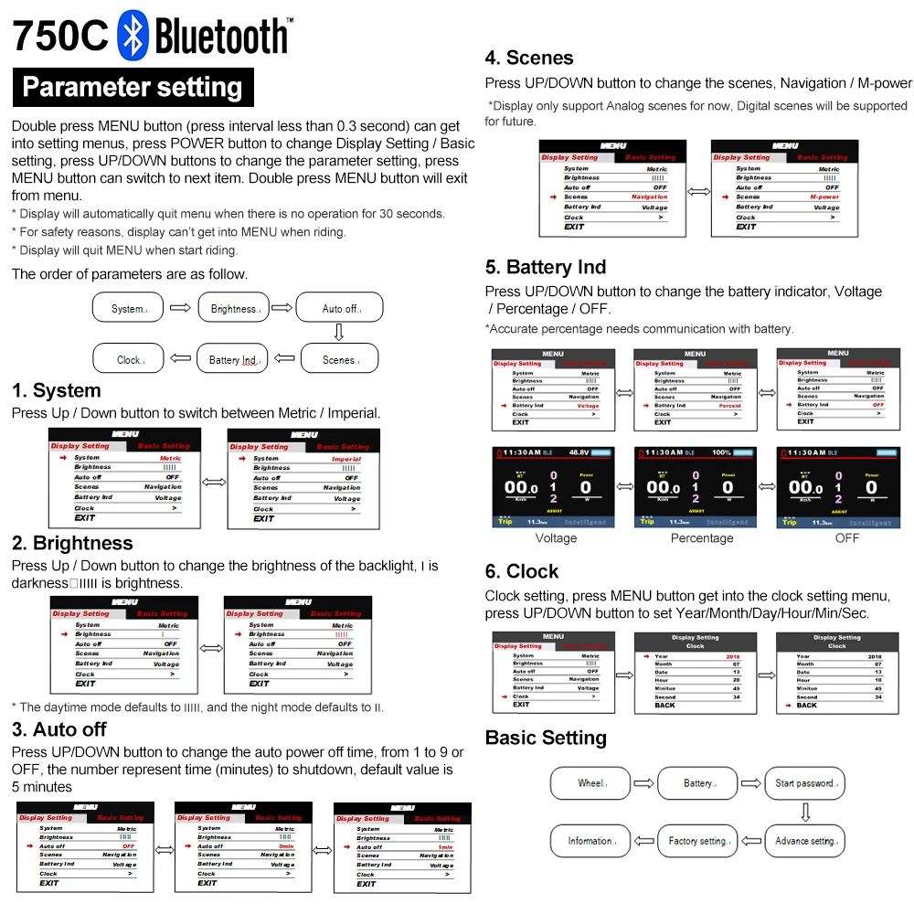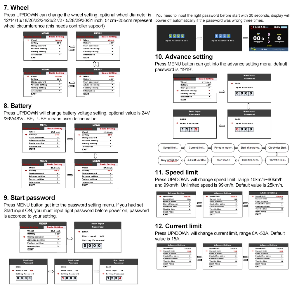 - Внимание:Не подключайте и не отключайте этот дисплей при включении питания.Избегайте столкновений.Защита мембраны дисплея для обеспечения водонепроницаемости.Не пытайтесь сбросить параметры, если дисплей не работает.Позвоните для обслуживания, если дисплей не работает.Установка:Установите дисплей и кнопку управления на руле и отрегулируйте его расположение. Подключите его к контроллеру с выключением питания.