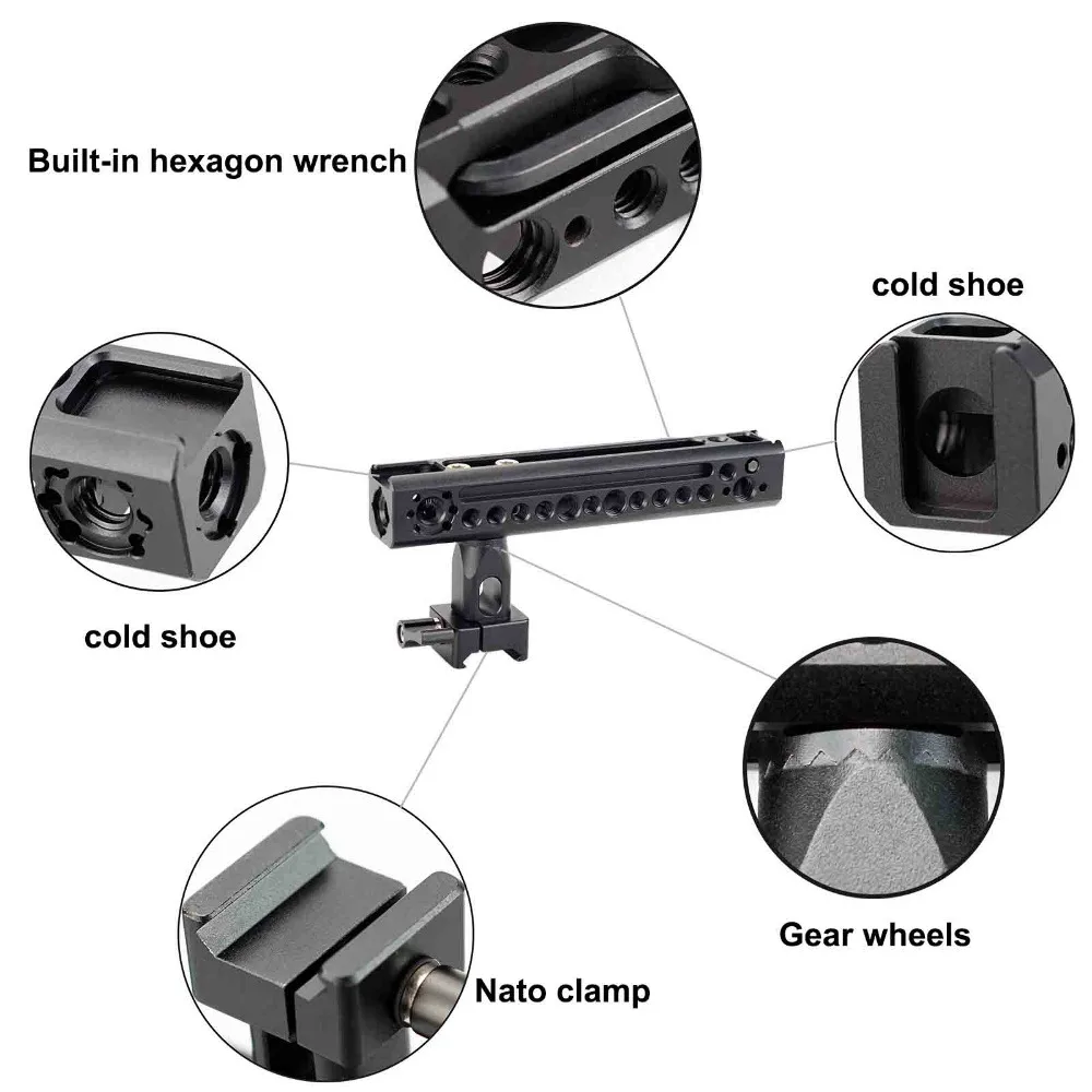 【 Встроенный держатель для холодной обуви и гаечных ключей эта ручка nato оснащена двумя встроенными креплениями для микрофона, светодиодный фонарь, волшебная рукоятка и т. д. Ручка nato поставляется с шестигранным ключом сбоку, который крепится через магнит внутри ручки.