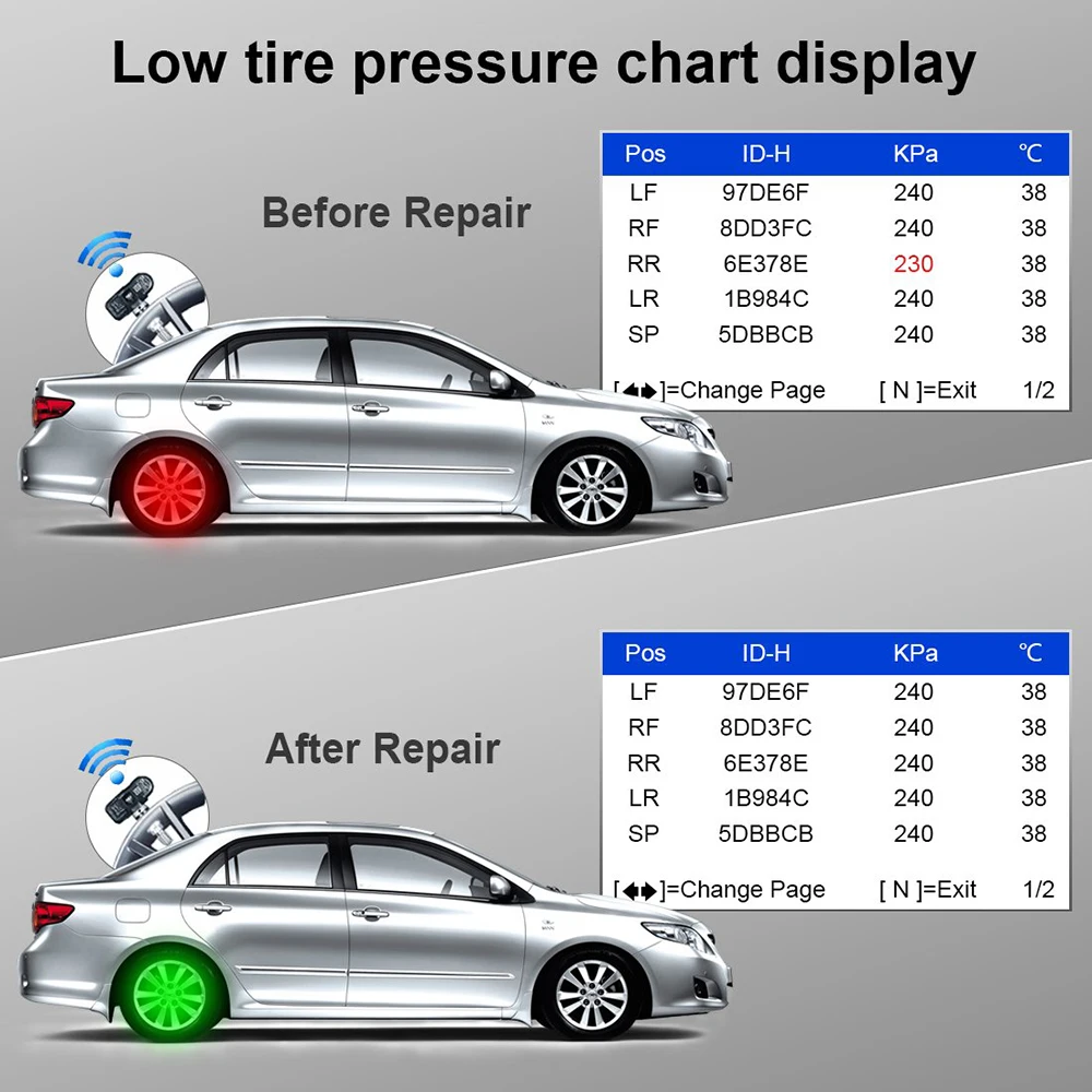 Одноэкранная Организация позволяет легко читать прямые отзывы от всех 4 датчиков, четко понять состояние всех функций TPMS, сравнить сенсор и данные ECU, затем мгновенно Определите неисправности системы для определения фиксации. Это на первый взгляд обзор всей информации о датчике легко показывает расположение, в котором находится сенсорная батарея, низкая, и ее необходимо заменить в ближайшее время.
