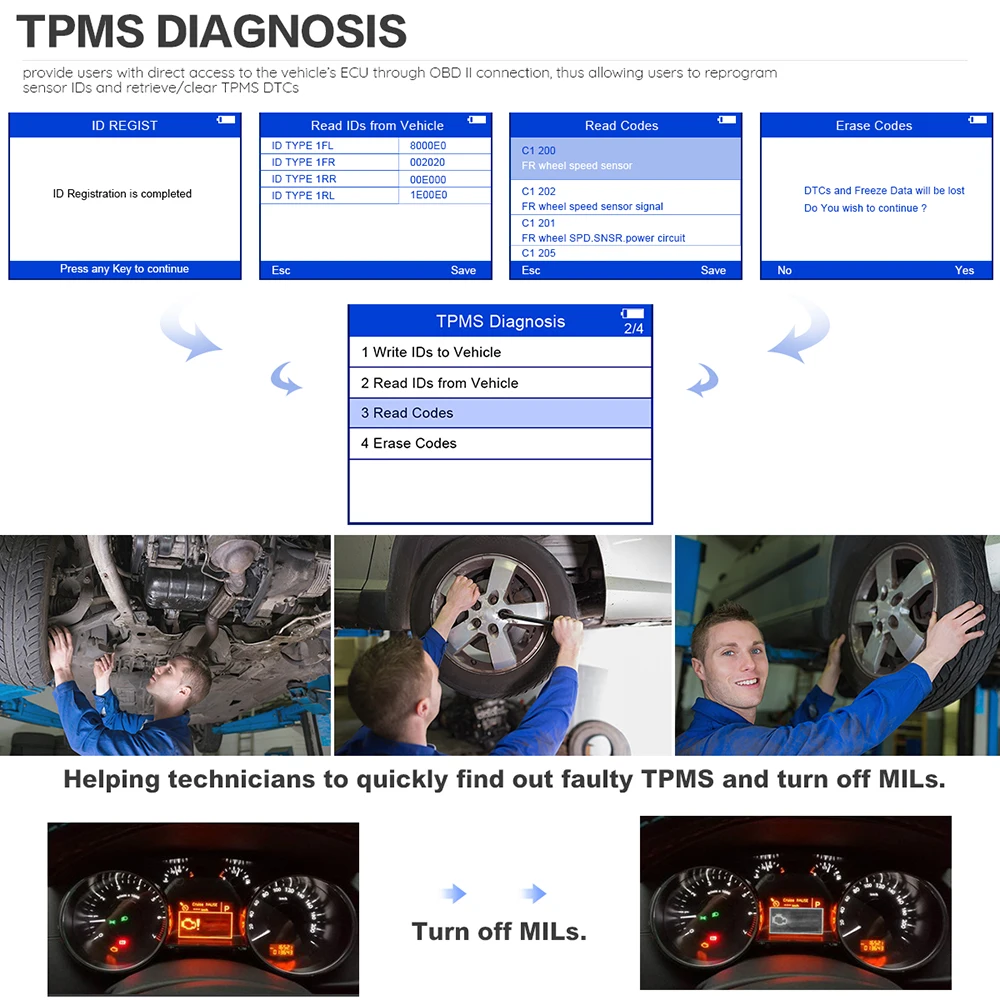 MaxiTPMS TS501 способен беспроводно диагностировать проблемы TPMS, а также активировать любые известные OEM/Универсальные датчики TPMS, идентификационные Клон или перепрограммируемые датчики на ECU транспортного средства и выключить предупреждающие огни.