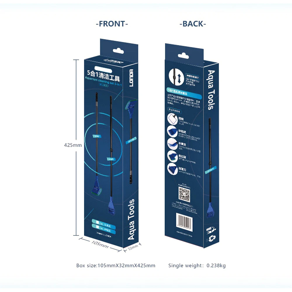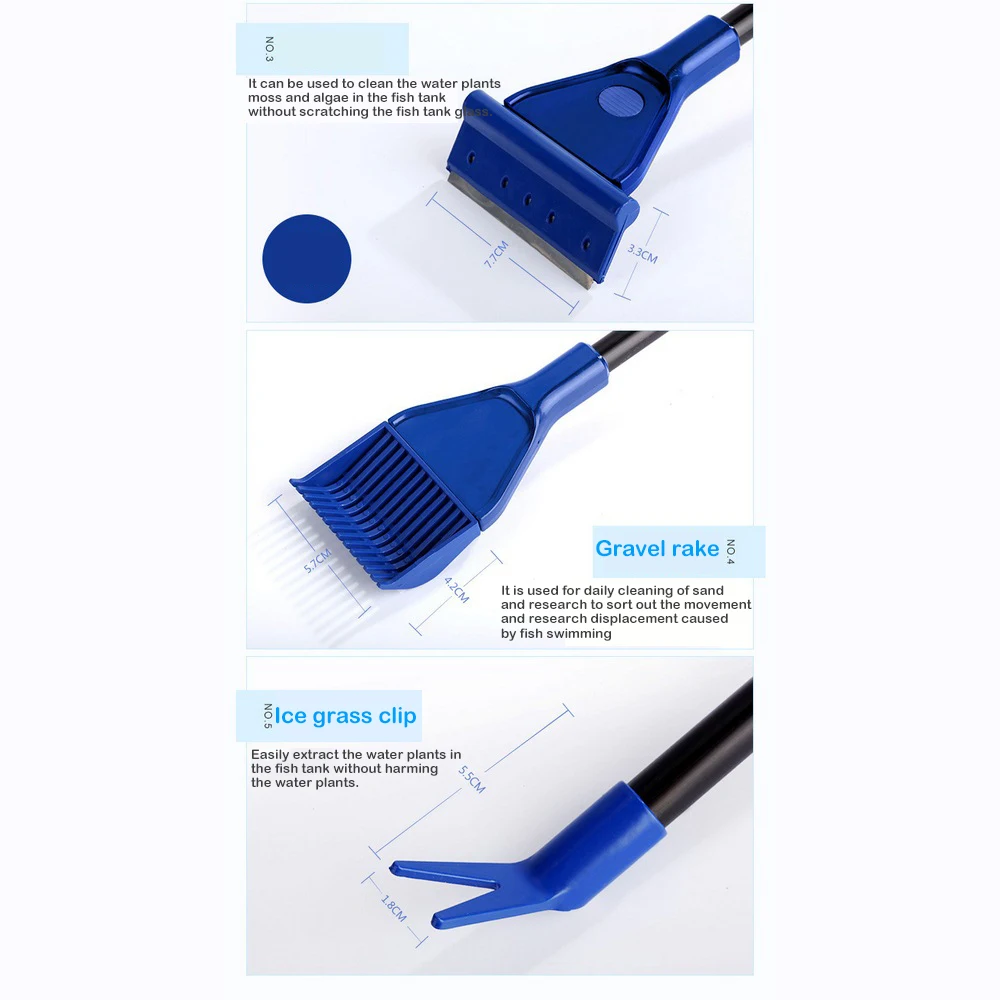 5 In1 Aquarium Cleaning Tools Set Fish Tank Net Gravel Rake Algae Scraper Fork Sponge Brush Glass Cleaner 54-80cm Telescopic Pole