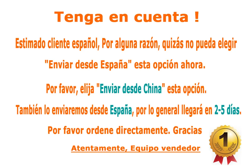 Для клиентов из Испании, если ваши первые два zipe кода являются те07, 35,38,51,52 области, мы не можем отправить посылка напрямую из Испании, пожалуйста, выберите «AliExpress Стандартная доставка» для отправки товаров из Китая. Спасибо.