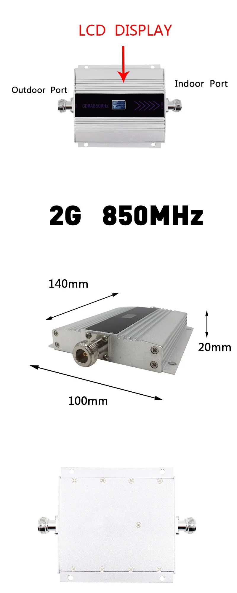 Ретранслятор 850 ЖК-экран 3G GSM /CDMA 850/800 МГц 850 МГц Ретранслятор Усилитель сотового телефона ретранслятор мобильного сигнала усилитель повторитель CDMA 850 МГц Частотный диапазон: Восходящий канал: 824-849 МГц Нисходящий канал: 869-894 МГц Усиление: 75 дБ Как работать: 1. Наружная антенна (антенна Yagi) принимает сигнал с базовой станции. 2. Затем передает сигнал ретранслятору через длинный кабель 3. Ретранслятор получает сигнал и улучшает его. 4. После этого сигнал будет направлен на комнатную антенну (панель/потолок/штыревая антенна), и, наконец, ваш сигнал мобильный телефон улучшится.