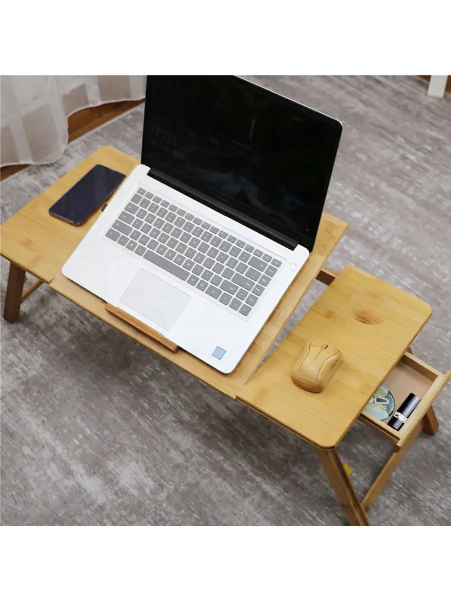 Столик-трансформер из бамбука подойдет для ноутбука, планшета или завтрака в постели, хорошо выполняет свои функции при этом служит достойным предметом интерьера. Столик выполнен из экологически чистого и прочного материала. Классический дизайн столика позволит легко вписаться в любой интерьер. Телескопические ножки позволяют регулировать высоту столика от 24 до 33 см. Регулируемую часть столешницы можно легко установить под необходимым для вашей комфортной работы наклоном. Столик позволяет работать в положении лёжа, благодаря чему вы снизите нагрузку на мышцы спины и шеи. Наличие на фиксированной части столешницы специального углубления позволяет разместить на ней стакан или кружку, а в маленьком боковом ящичке можно хранить флешки и другие полезные мелочи. Специальные отверстия на регулируемой части столешницы позволяют осуществлять вентиляцию и отвод тёплого воздуха от ноутбука/планшета. Столик - трансформер станет отличным подарком для родных, друзей и коллег.