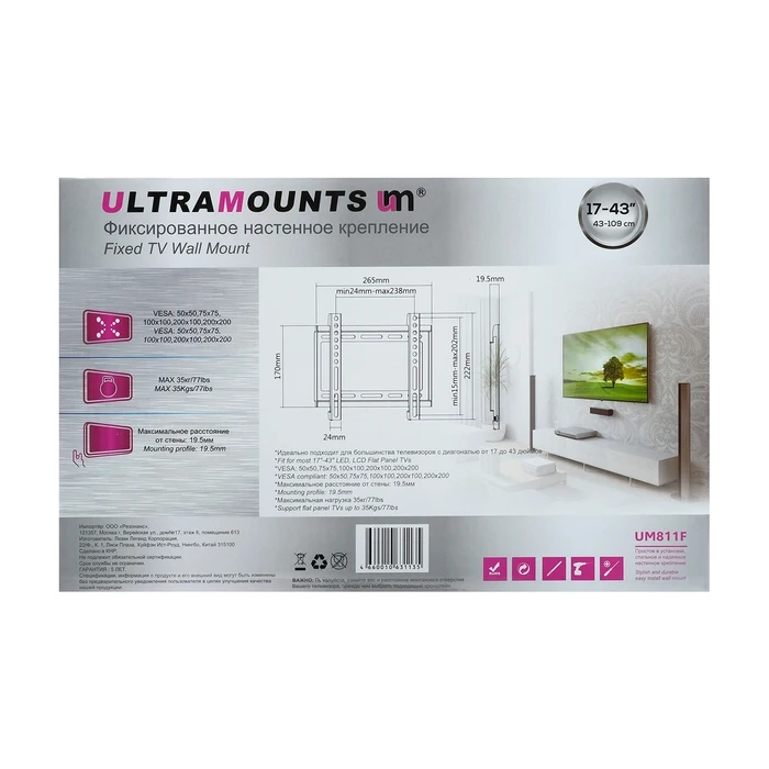 Кронштейн Ultramounts UM811F, для ТВ, фиксированный, 17-43", 19.5 мм от стены, черный 2604974