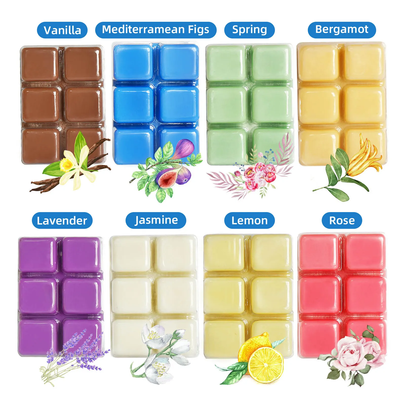 Есть 8 восковых теплых кубов с ассорти расслабляющих ароматов: рис, ваниль, лаванда, бергамот, лимон, жасмин, Роза и весна, 6 кубиков на аромат.