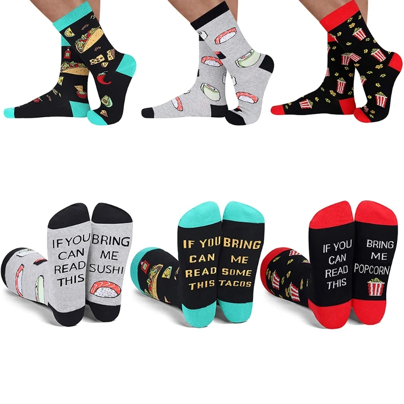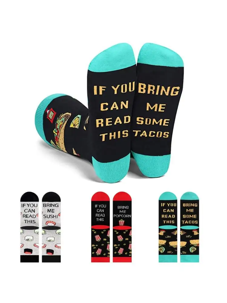 В верхней части носков представлены Тако/Попкорн/суши, а нижняя часть пришита веселым скрытым сообщением: «Если вы можете прочитать это-принесите мне Тако/Попкорн/суши».